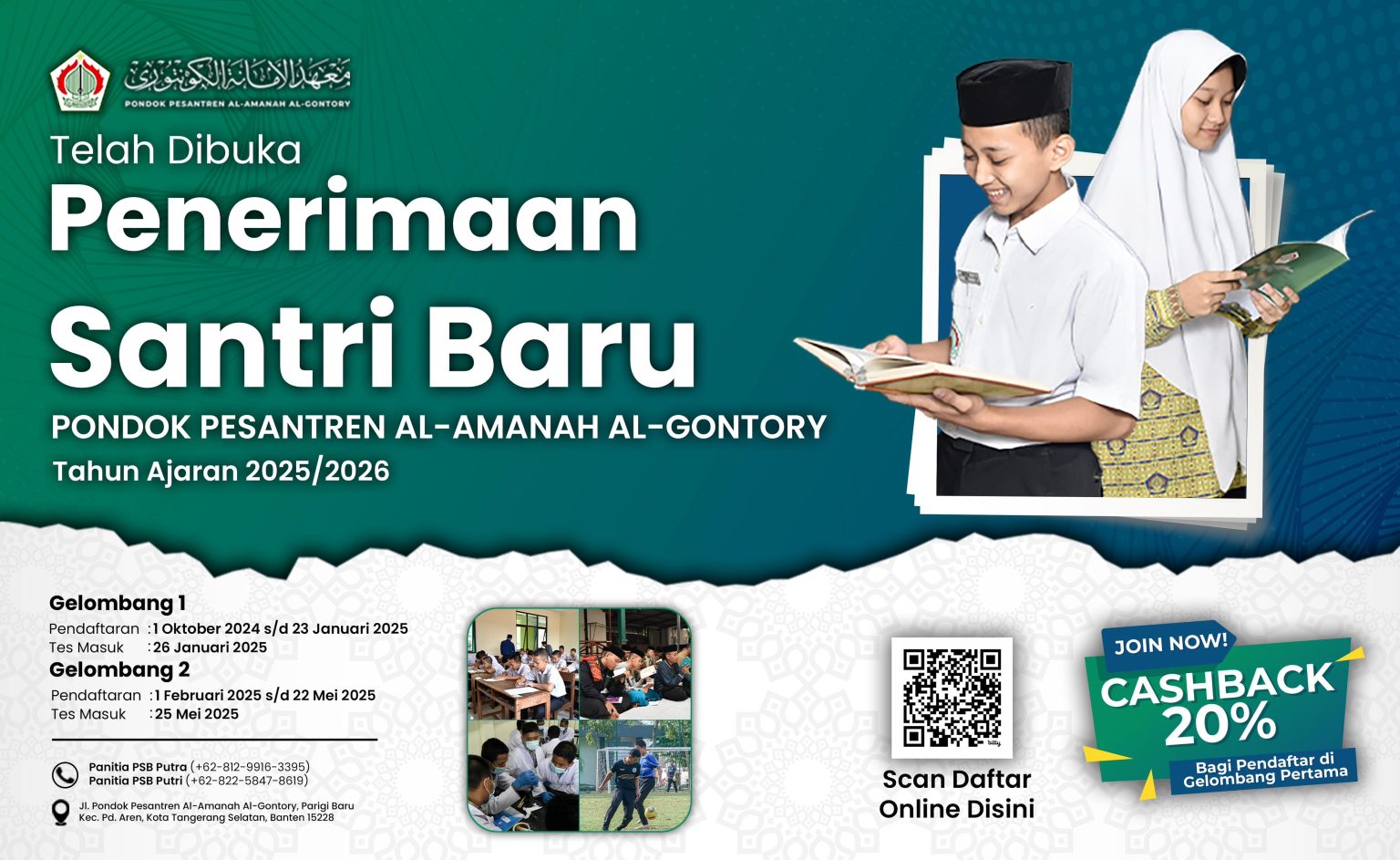 Terima kasih atas perhatian dan kepercayaan yang Bapak/Ibu berikan kepada Pondok Pesantren Al-Amanah Al-Gontory. Semoga, pendidikan terbaik yang kita idam-idamkan untuk Ananda, dapat kita berikan bersama-sama, dan dimudahkan prosesnya oleh ALLAH SWT, Aaamiiin.